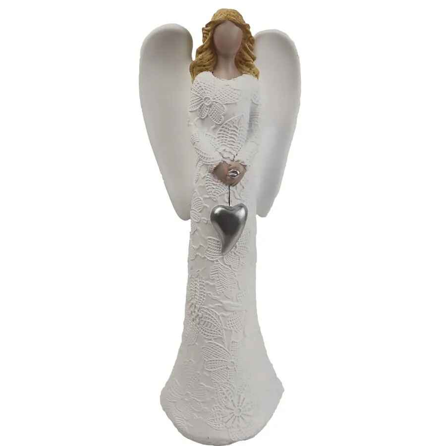 Andílek v bílých šatech s plastickým dekorem kytiček drží v rukou stříbrné srdíčko. Figurka anděla je vyrobena z polyresinu, hmoty napodobující keramiku. Anděl má v 14,5 x š 5 cm. Krásný dáreček pro milovníky andílků.