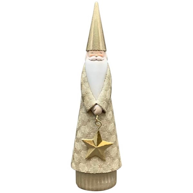 Vánoční dekorace Santa Lilian ve smetanovo zlatém provedení má výšku 23 cm a průměr 5,5/7,5 cm. V ruce drží santa zlatou hvězdičku. Figurka je vyrobena z polyresinu, hmotě napodobující keramiku ( je rozbitná).