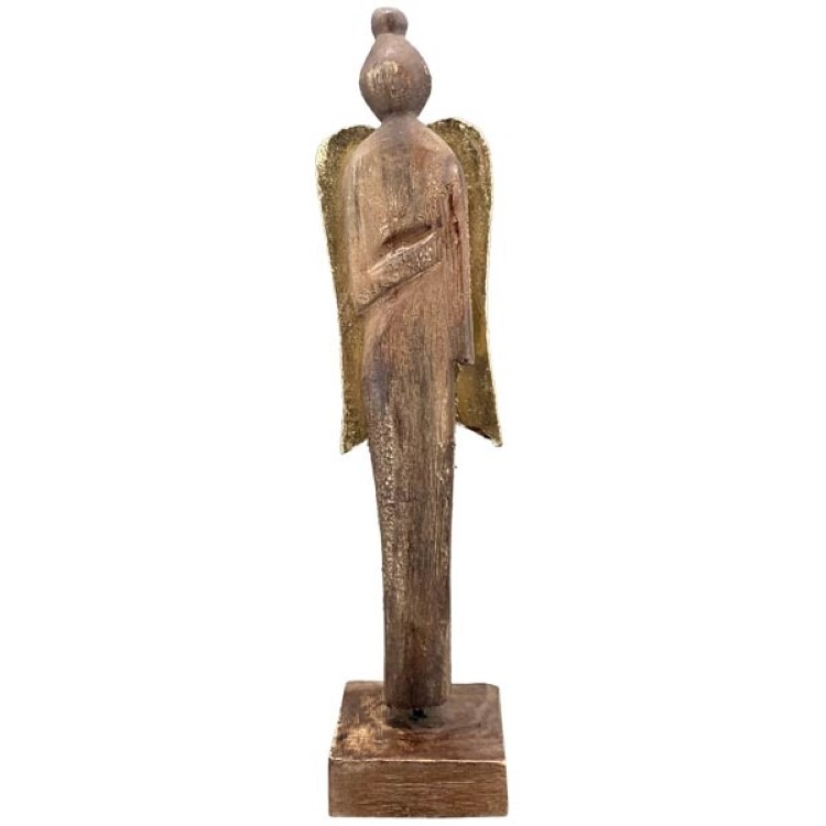 Dřevěná andělka Artisan v tmavohnědé barvě s dřevěnými , zlatými křídly . Anděl je umístěn na dřevěném podstavci 10 x 10 cm. Šířka anděla je cca 10 cm a výška 40 cm. Anděl je z kolekce Artisan od německého dodavatele Exner - Wohnaccesoires. Tohoto krásného, ručně varobeného anděla ocení hlavně milovníci přírodních materiálů. Země výroby je Indie.