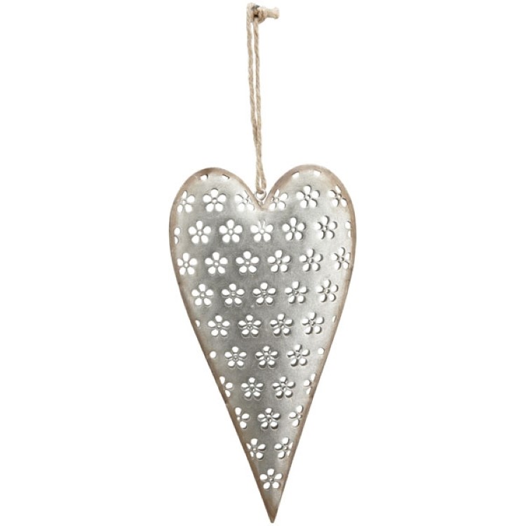 Závěsná kovová dekorace SRDCE ve stříbrné barvě, po okrajích s patinou rzi. Patina není vadou, ale předností. Plastické srdce s děrovaným dekorem kytiček má rozměr 18,5 x 2 x 9,5 cm.