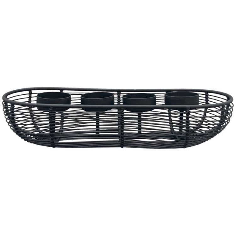Černý kovový svícen Sobre na 4 svíce. Svícen, ve tvaru mísy je ,oválný a uvnitř má misky na svíce . Doporučujeme čajové svíce nebo svíce o pr. 39 mm. Rozměr svícnu je 28 x 12 x 7,5 cm. Svícen využijete celoročně, můžete jej různě dodekorovat.