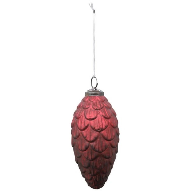 Skleněná báňka Šiška Vitreous v červené barvě o rozměru 7 x 15 cm. Povrch báňky je pokovený s plastickým dekorem napodobujícím šišku. Vršek je v tmavém kovu. Báňka je dosti veliká, takže doporučujeme na velký vánoční strom, nebo zavěsit třeba do okna.