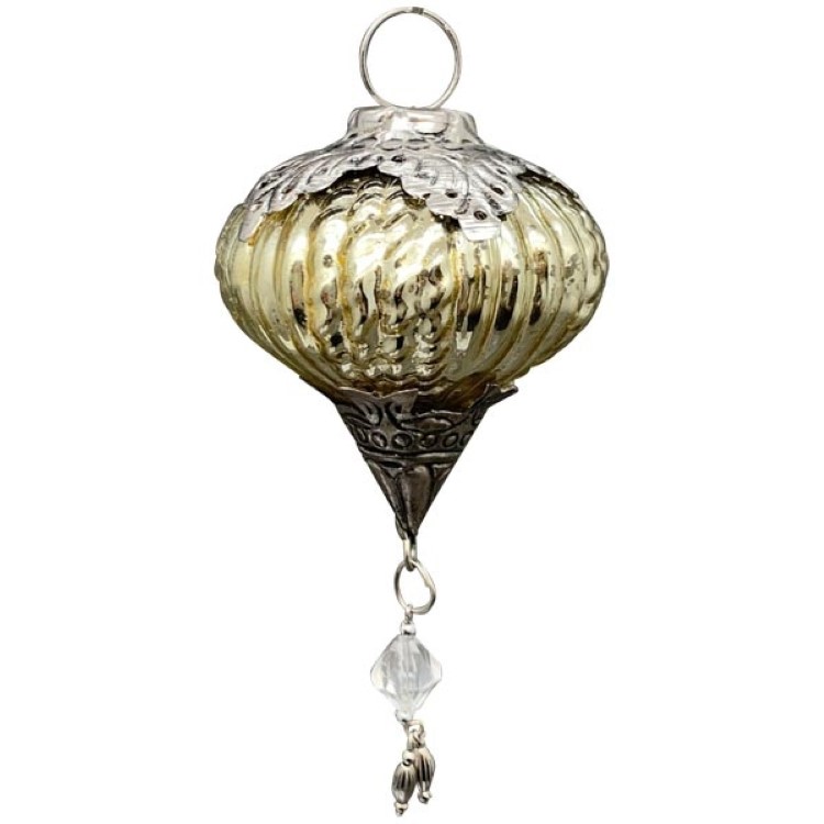 Skleněná vánoční Báňka Vitreous ve stříbrné barvě s tepanou špičkou i vrškem. Ve spodní části je na tepané špičce zavěšen krystal. Báńka je pokovená s plastickým vroubkováním. Báňka má průměr 7,5 cm a délku 9,5 cm.